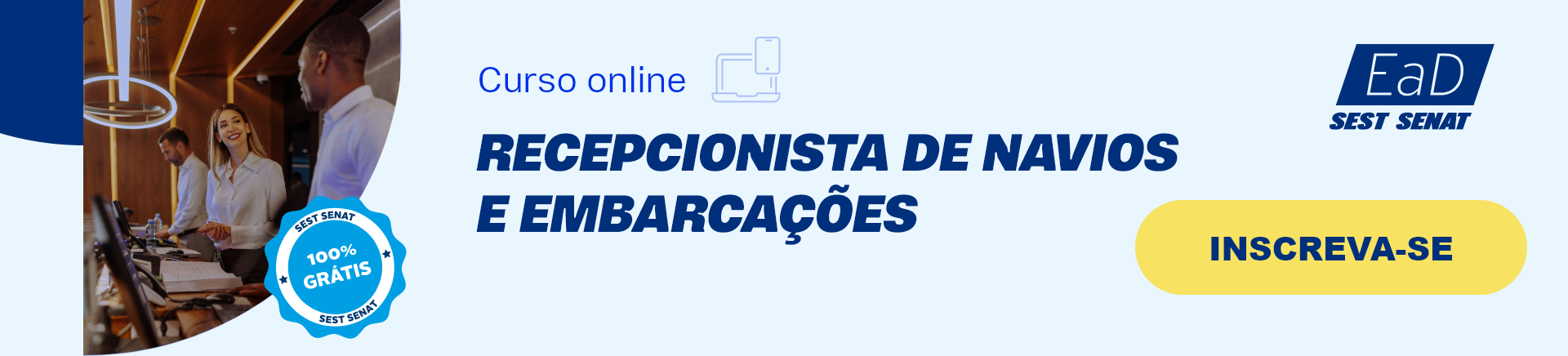 Agora, para quem busca atuar no setor de transporte marítimo, o curso de Recepcionista de Navios e Embarcações oferece uma formação completa para quem deseja trabalhar em ambientes como navios e embarcações, prestando atendimento ao cliente e auxiliando nas rotinas operacionais.